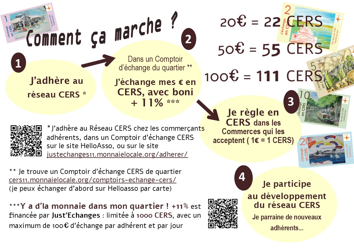 Ben oui, c’est possible ! Si c’est pour une période donnée… Alors profitez-en ! Pour faire connaître la Monnaie Locale CERS et les (gros) avantages à l’utiliser, l’association Just’Echanges finance + 11 % de CERS sur vos échanges € ! (1000 CERS ont été crédités pour cette action, qui cessera quand cette somme sera atteinte).
